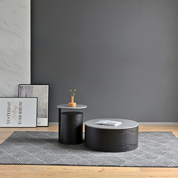 The Ava 2-piece coffee table set touches on high-end contemporary design. The combination of round elements comprises of a generous main table accompanied by a smaller satellite table. This unique set offers the flexibility to group them into one stylish compact arrangement or to separate them out for individual use. Both tables feature smooth grey sintered stone. The dark grey 2Pac paint finish of the larger drum table adds gravitas to the centrepiece. The black finished metal pedestal leg frame of the satellite table adds light whimsy to the pairing. The soft tonal colouring will bring sleek sophistication to any living area.