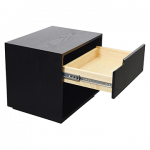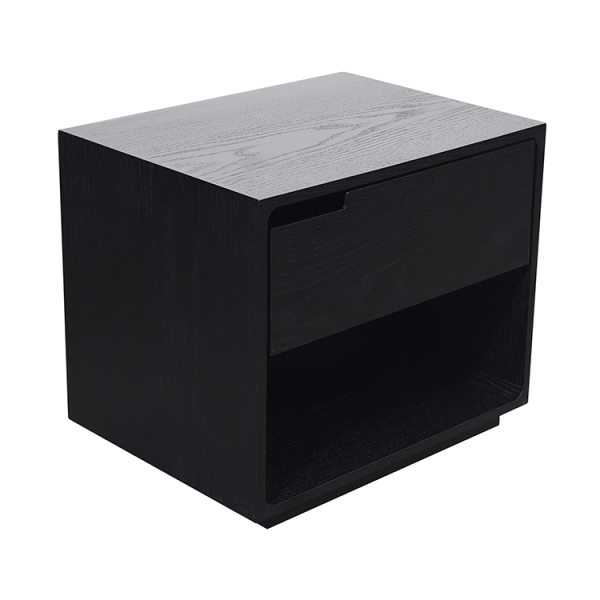 The Cairo bedside table is a part of a tastefully on-trend bedroom range. It features a stylish rectangular shape and combines paired back simplicity with attention to detail for a striking minimalistic aesthetic. With a roomy drawer and open storage space available underneath it, this bedside table provides an abundance of functional storage. Whilst its inset base and cleverly integrated cutout drawer pull draws the eye to its effortlessly stylish details. This ideal design solution for both storage and style in its black timber grain finish is perfect to mix-and-match with many bedroom settings for your personalised ensemble.